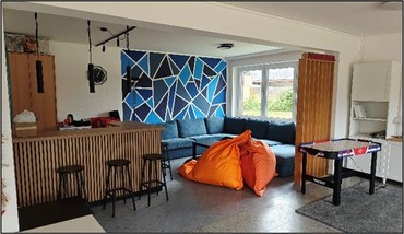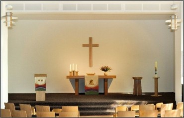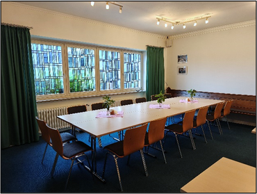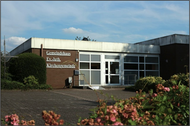 Gemeindehaus mit teilbarem Saal, Büros, Jugendraum, Toiletten, Küche.