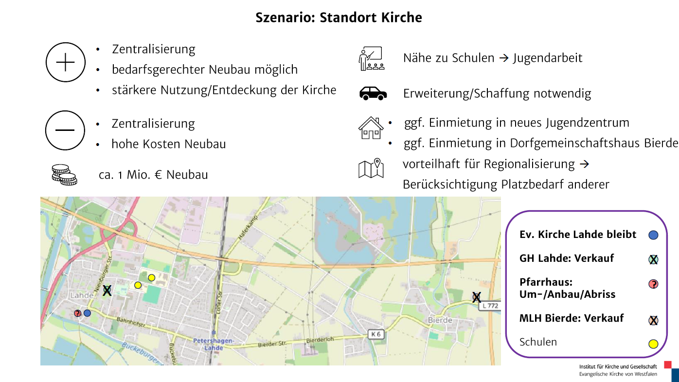 Alle Szenarien wurden hinsichtlich Vor- und Nachteilen bewertet. Außerdem hat das Projektteam die Nähe zu den Schulen, Parkflächen, Einmietungen und die Regionalisierung betrachtet.