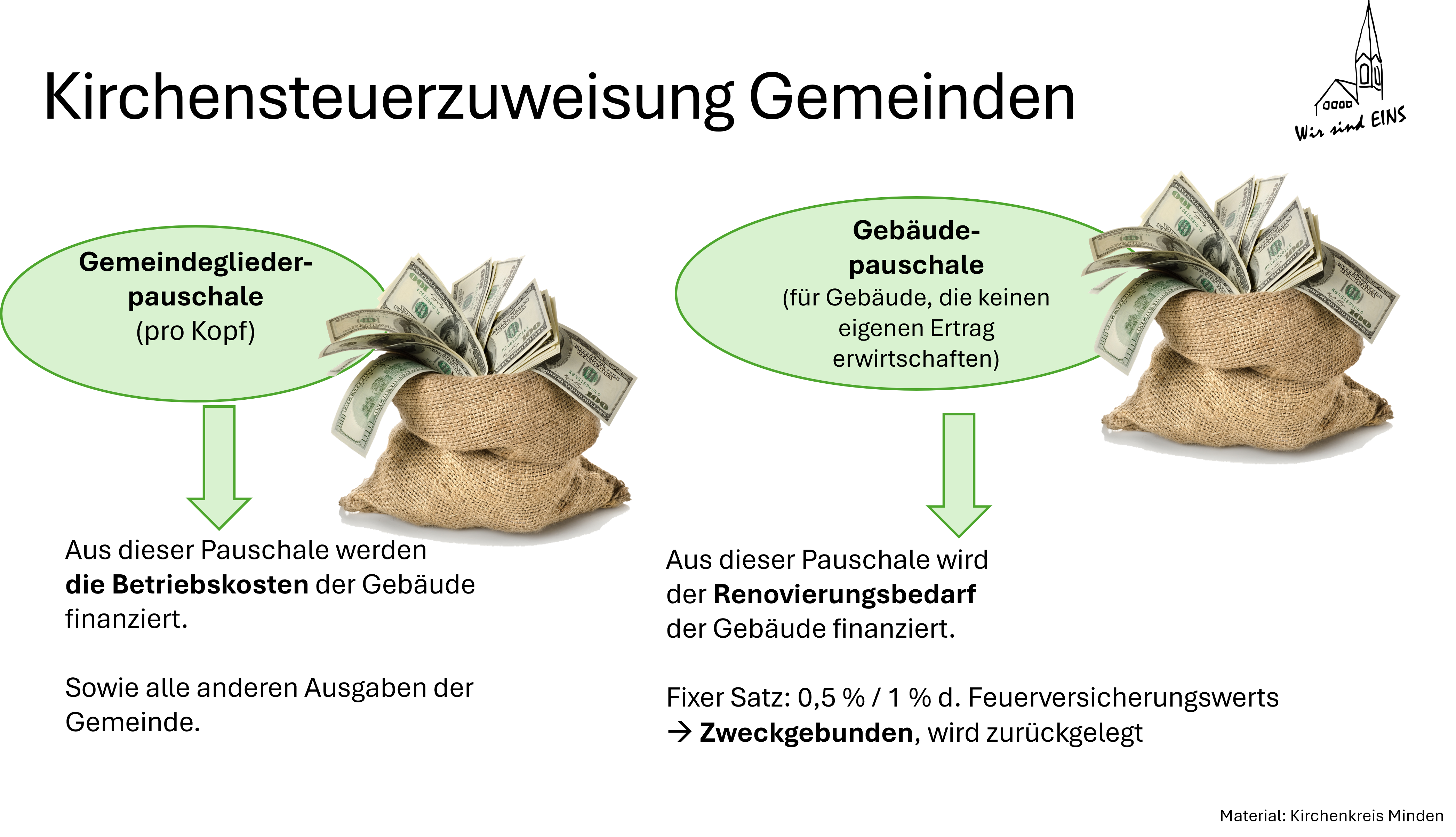 Im Kirchenkreis Minden erhalten die Gemeinden aktuell ca. 37 % der Kirchensteuer über die Gebäudepauschale sowie ca. 63 % über die Gemeindegliederpauschale.