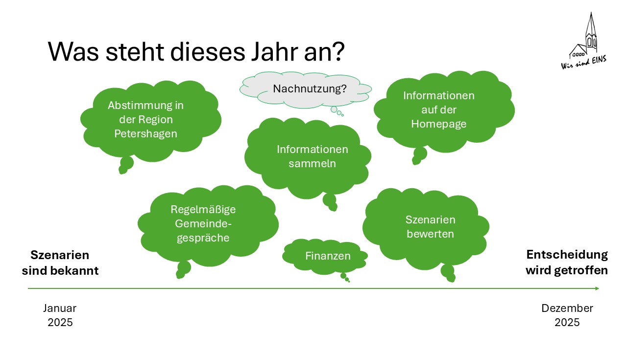 Bis zur Entscheidung für ein bestimmtes Szenario werden weiter Informationen gesammelt und alle Updates auf der Homepage bereitgestellt. Es wird regelmäßige Gemeindegespräche im Jahr 2025 geben.