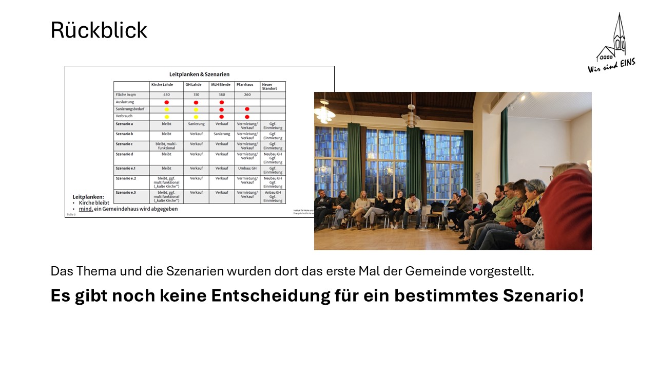 Mit der gesamten Gemeinde wurde zum ersten Mal auf der Gemeindeversammlung im November 2024 über das Thema "Gebäudeentwicklung" gesprochen.