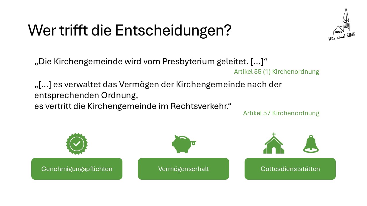 Allerdings werden die gewählten Presbyterinnen und Presbyter schließlich die Entscheidung treffen, wie mit den Gebäuden umgegangen wird.