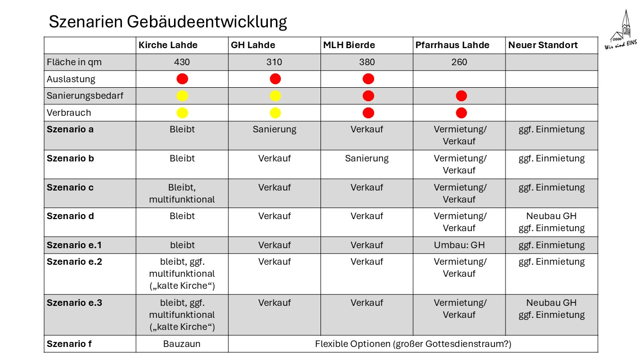Zusätzlich zur Folie vom 16.11.24 wurde ein Szenario "f" auf Anregung aus der Gemeinde eingeführt. Bei der Kirche Lahde handelt es sich um ein Baudenkmal, sodass in eine Grundsubstanz immer investiert werden muss. Eine (zumindest theoretische) Option wäre allerdings, die Kirche im Fall der Fälle nicht mehr zu nutzen und einen Bauzaun zu errichten. Bei den anderen Gebäuden wäre man dabei flexibel, allerdings würde ein großer Gottesdienstraum fehlen.