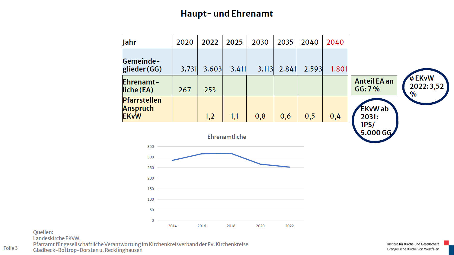 Wir sehen erneut die Gemeindegliederentwicklung. Zusätzlich dargestellt ist die Anzahl der Ehrenamtlichen in der Gemeinde, die erfreulicherweise deutlich über dem Schnitt der EKvW liegt.