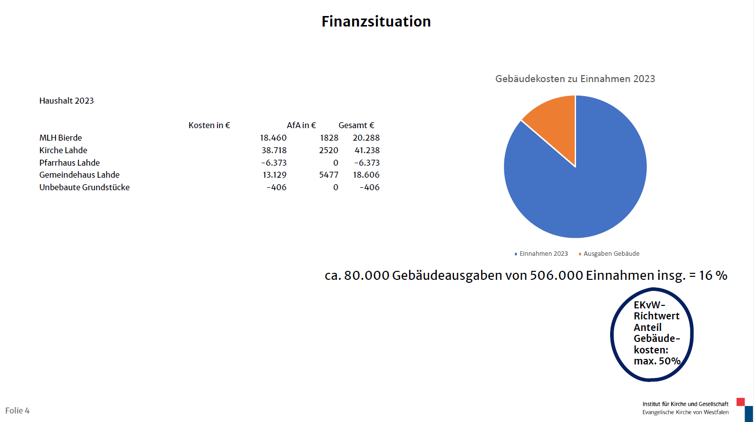 Die Kosten für Gebäudebetrieb (ohne Personal) lagen 2023 bei ca. 16 % der Kirchensteuer-Einnahmen. Allerdings wurden in den letzten Jahren auch keine größeren Unterhaltungsmaßnahmen an den Gebäuden durchgeführt, sodass diese Zahlen nicht repräsentativ sind.